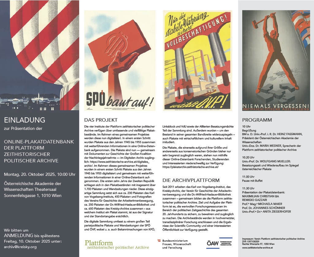 Im Rahmen eines gemeinsamen Projekts der Plattform zeitgenössischer politischer Archive wurden in einem ersten Schritt alle Plakate aus den Jahren 1945 bis 1955 in eine Online-Datenbank aufgenommen und sind im Digitalen Archiv plakatarchiv.zeithistorische-archive.at öffentlich zugänglich.